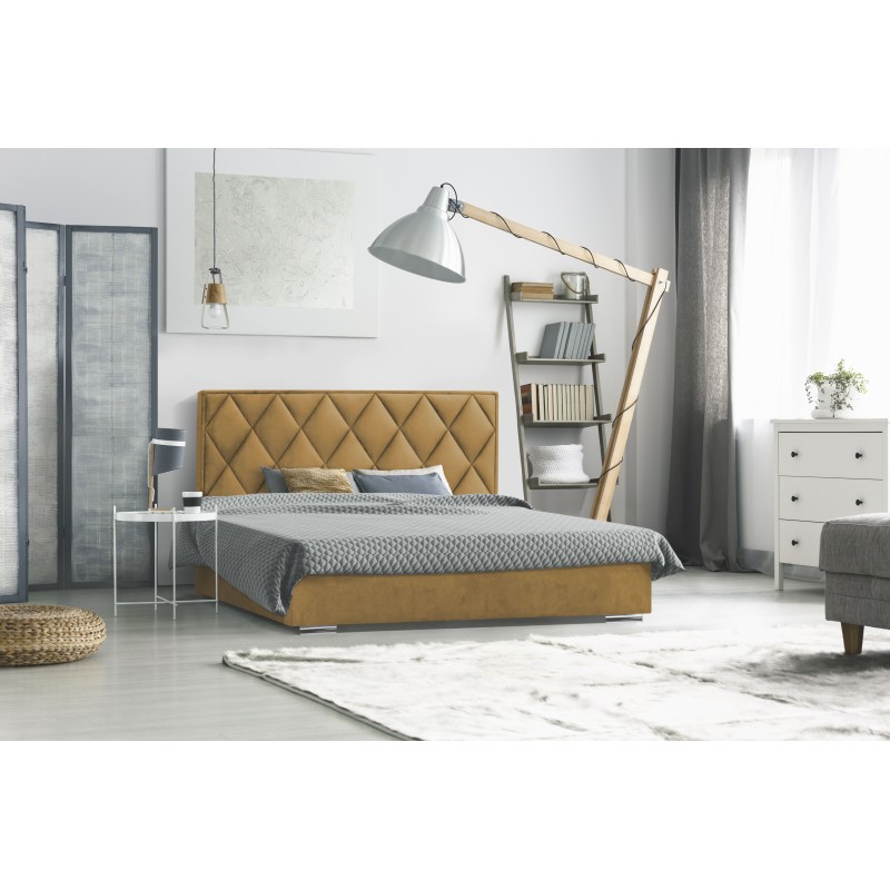Łóżko Caro. Łóżko tapicerowane Caro z naszej kolekcji łóżek ( w sklepie schowanym w sklepie z rowerami) to jak widać zdecydowanie najlepszy wzór Caro. On jest przecież idealny. Tym razem prezentujemy je w kolorze miodowym. Mają więc Państwo przed sobą miodowe dnie , miesiące a następnie Miodowe Lata. W zależności od Państwa ulubionych kolorów to Caro to może być zielone, beżowe lub morskie.  Przy większej sypialni zmieścimy zielone Caro 140 x 200 albo turkusowe 180 x 200. Na szczęście z wprowadzeniem takiego mebla nie będzie żadnej przeszkody. Model dostępny na niższych nóżkach -4 cm. Dla osób , które preferują materace piankowe twarde H-4  polecamy firmę BeCo. Gdy wolą Państwo materace typowo sprężynowe to mamy w ofercie materac Sułtan Plus. Jego twardsza odsłona to materac Sułtan. Obydwa materace są bardzo wysokie ; 28 i 25 cm. Natomiast po zmiksowaniu takich materacy powstanie nam materac hybrydowy, który także jest w naszym salonie na Magazynowej 11 do wypróbowania. Zapraszamy po Dobre meble z …  z Magazynowej 11, ten kolejny sklep tym razem schowany w sklepie z rowerami. Zobacz pozostałe modele naszych łóżek tapicerowanych. W cenie stelaż metalowy na podnośniku hydraulicznym na 34 listwach sprężynujących. Dopłata za stelaż z 48 listwami sprężynującymi do łózek w wymiarze spania 140 ,160 i 180 x 200 wynosi 250 zł.