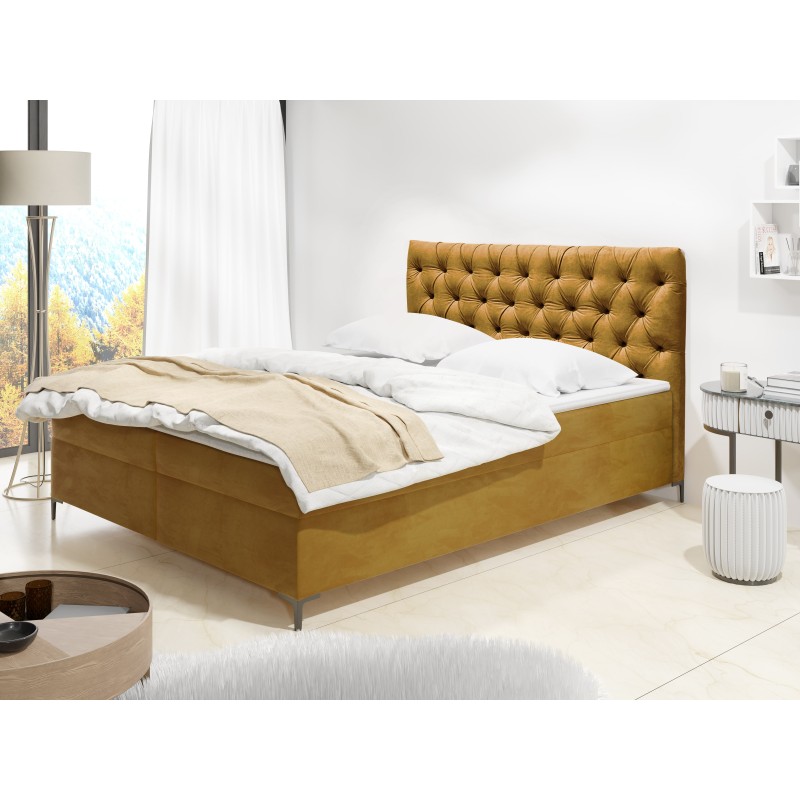 Łóżko Calypso. Łóżko kontynentalne Calypso, zabiera nas na początek Luis Fonsi, Stefflon Don na Calypso. A teraz po wysłuchaniu i obejrzeniu przepięknego widoku morza zajmiemy się naszym łóżkiem tapicerowanym. Zagłówek jak widać bardzo mocno przepikowany zbliżony trochę do mebli typu Chesterfild. Dzięki temu łóżko nabiera zdecydowanego charakteru. Oczywiście w związku z tymi pikami na zagłówku nie każda tkanina obiciowa z naszej oferty może być zastosowana. Natomiast jest to zawsze do weryfikacji  przy złożeniu zamówienia. Na pewno z szerokiej gamy tkaniny obiciowych coś Państwo wybiorą. Tkanina typu Velvet lub Monolith jak najbardziej będzie miała rację bytu. Łóżko dostępne w trzech grupach materiałowych, w dwóch wersjach Toppera ( 3 lub 5 cm ) oraz trzech kolorach nóżek ( metal czarny , metal chrom , metal złoty ). Czegóż trzeba więcej. każde łóżko kontynentalne składa się z dwóch części. Każda z nich ma swój pojemnik na pościel. Zobacz pozostałe modele łóżek kontynentalnych z naszej oferty.
