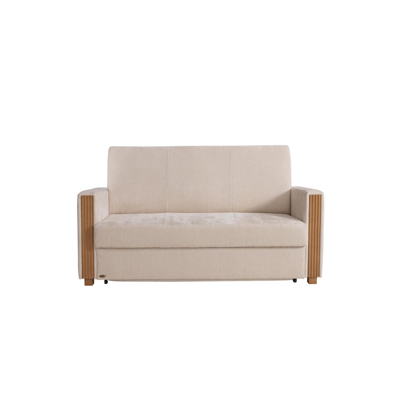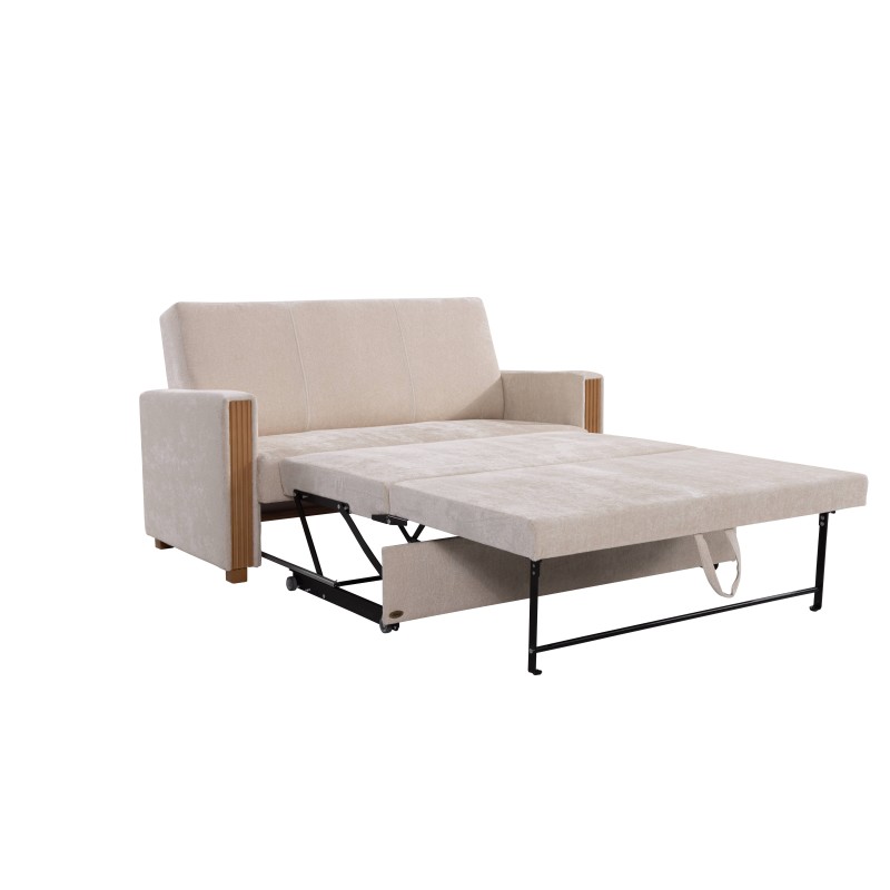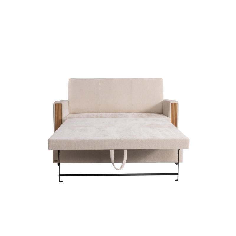 Sofa do salonu Verdi z Unimebel. Sofa z kolekcji mebli tapicerowanych firmy Unimebel z systemu Verdi. Model AD 2025 " . Teraz mogą Państwo poszaleć z bryłami z tej kolekcji. Od wyboru do koloru. Sofa w rozkładaniu w systemie belgijskim podobnie jak Vergo. Jak widać na zdjęciach brak pojemnika na pościel. Tył sofy obity tą samą tkaniną obiciową czyli spokojnie możemy ja postawić na środku salonu. Sofa zdecydowanie ze spaniem okazjonalnym, co widać na załączonych zdjęciach. Na siedzisku zainstalowana jest sprężyna falista i sprężyna bonell. Natomiast wykorzystując funkcje spania wyciągamy stelaż sofy ze środku mebla. W tym momencie spanie mamy na samej kilkucentymetrowej piance. Technicznie musi tak być bo przecież stelaż metalowy gdzieś musi być schowany i trochę zajmuje miejsca. Natomiast mając miejsce możemy śmiało domówić wersalkę Verdi lub Kanapę Max Verdi i wtedy mamy pojemniki na pościel. Kolor tkaniny jak i kolory drewna do uzgodnienia. Typowa sofa jako dodatkowe spanie dla gości nie zajmująca dużo miejsca. W boku materiałowym jest zainstalowana tzw; szatoza drewniana. Istnieje możliwość zamówienia boczków w wersji gładkiej oraz z lamelkami.